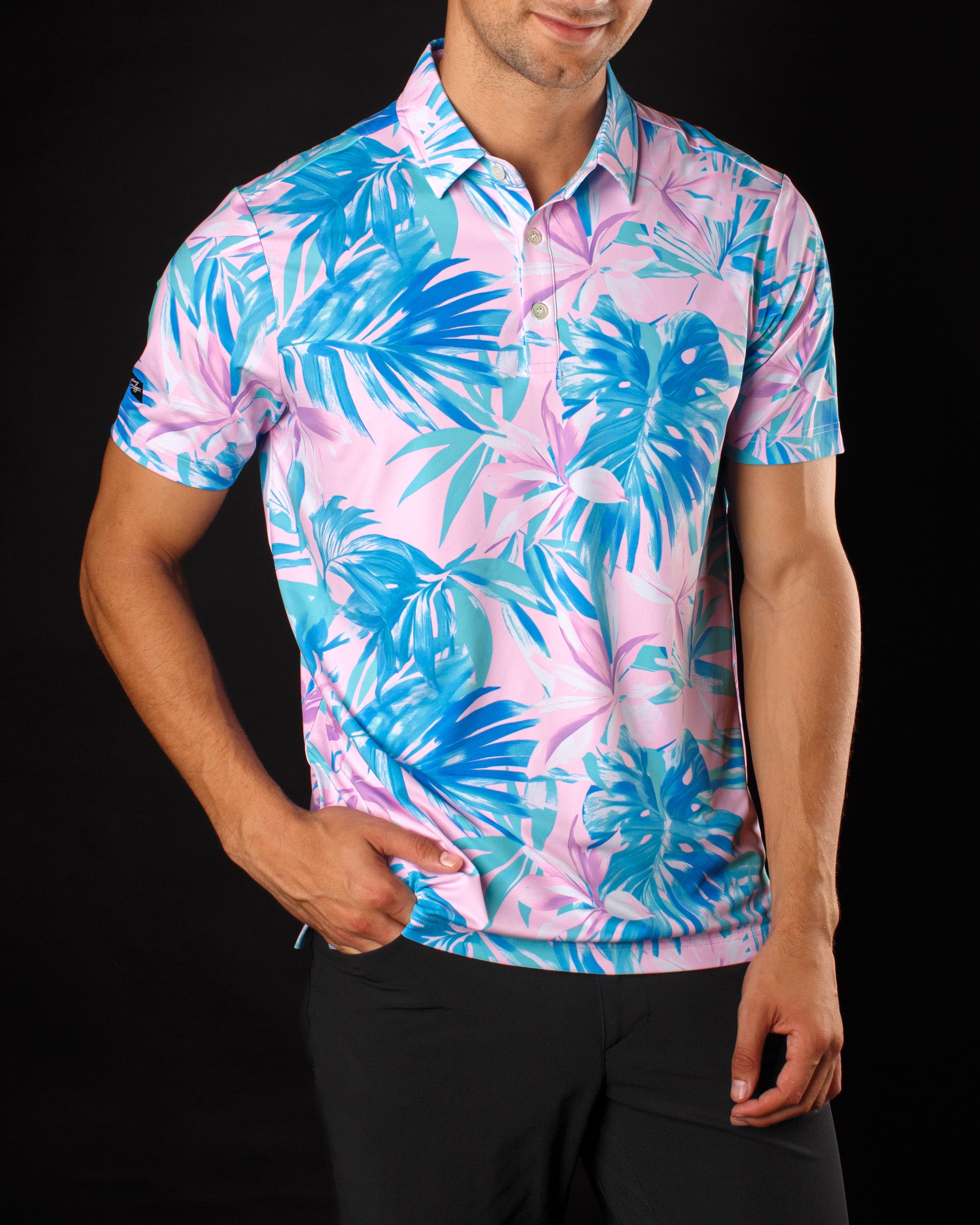 An attractive couple wearing matching bright pink golf polos