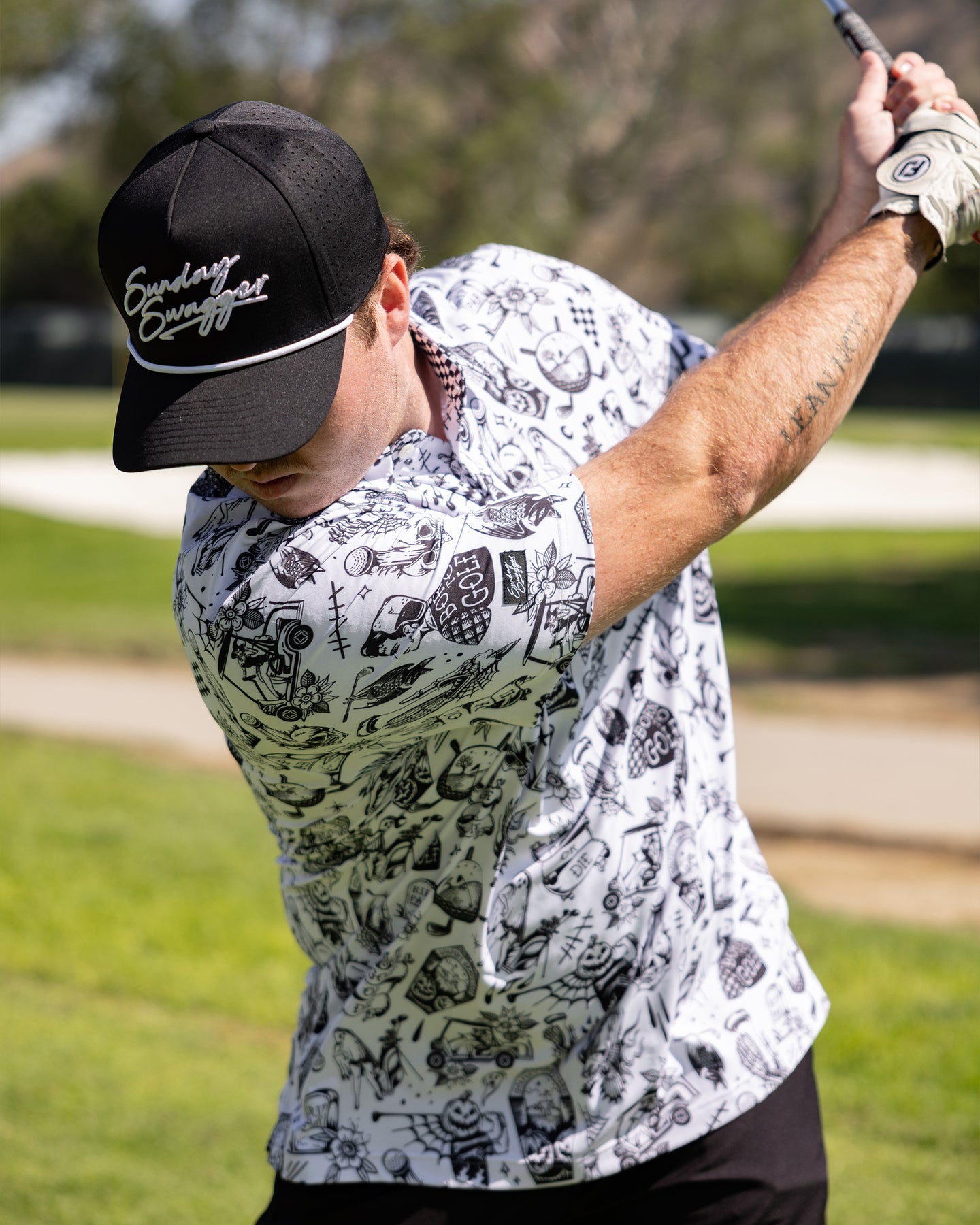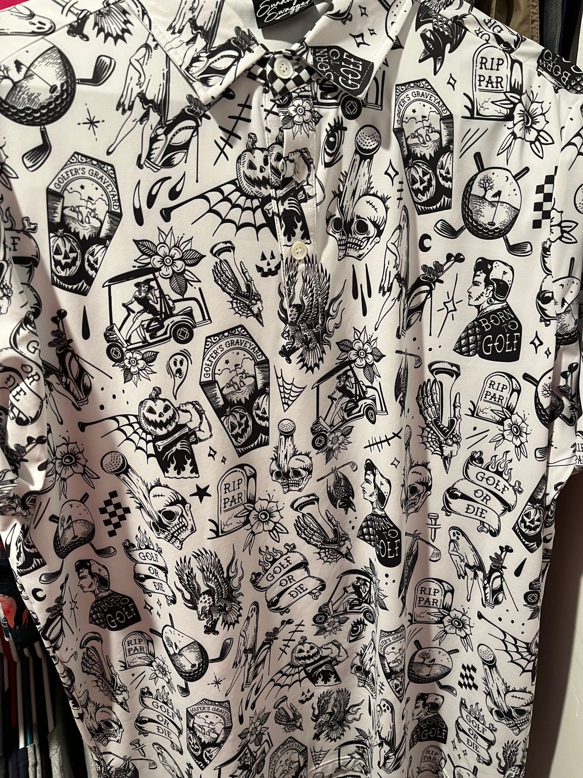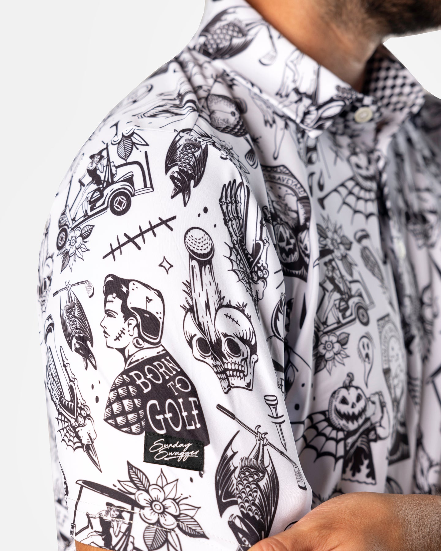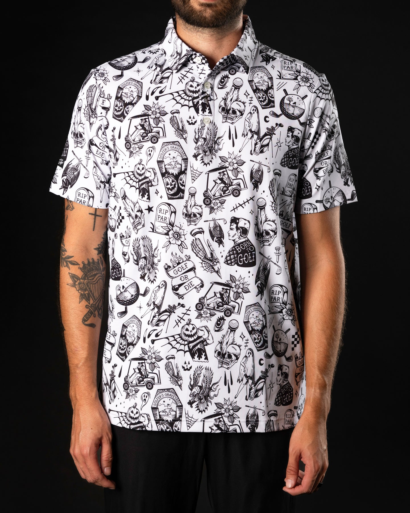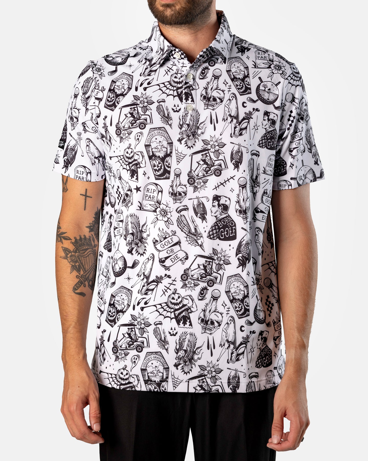 In a world where the mystic shadows of Halloween meet the illustrious, green landscapes of golf, emerges a polo so hauntingly stylish, it sends shivers down the spine! Traditional tattoo art and eerie Halloween imagery adorns your torso, casting an unbreakable spell of charm and intrigue. Each stitch whispers tales of ghoulish golfers forever captured in black ink.